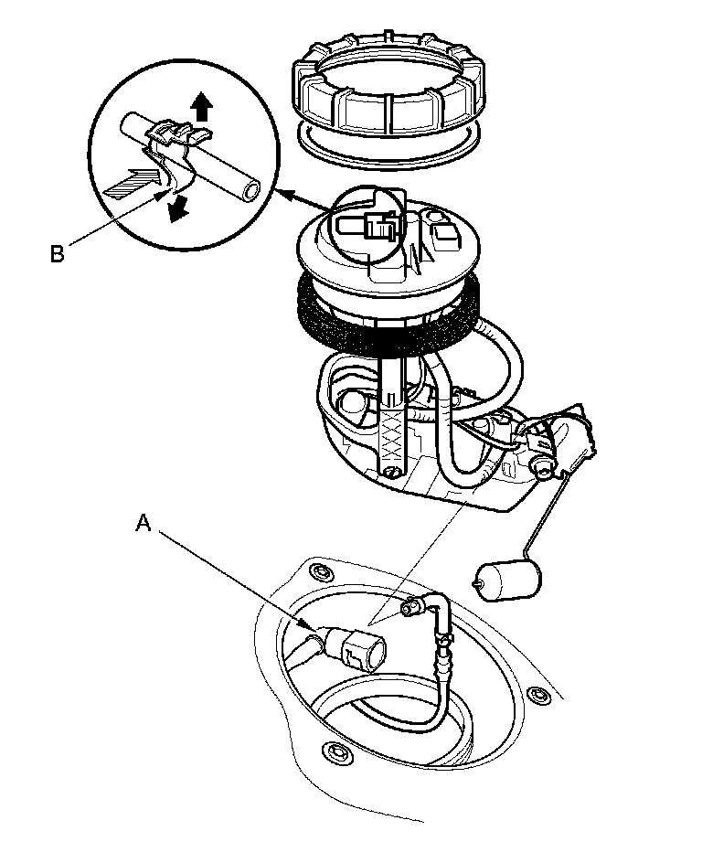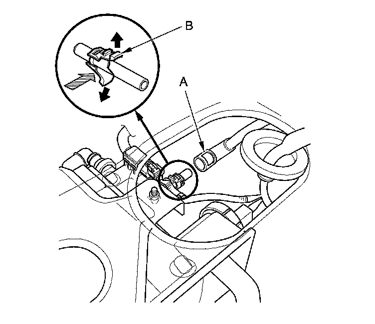 3. Before connecting a new fuel line/quick-connect fitting assembly (A), remove the old retainer (B) from the mating line.