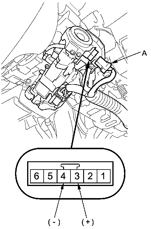 4. Connect power to steering lock 6P connector terminal No. 3, and ground the steering lock 6P connector terminal No. 4. Check that the ignition key cannot be turned to LOCK (0). Disconnect power and check that the key can be turned to the LOCK (0) position and removed from the cylinder.