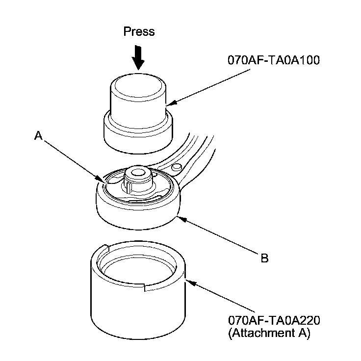 2. Press out the compliance bushing (A) with the bushing driver, the bushing receiver set (attachment A), and a hydraulic press, and remove the bushing from the lower arm (B).