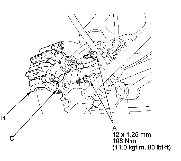 NOTE: Make sure the washers (C) are reinstalled between the brake caliper bracket and the knuckle, if they are removed.