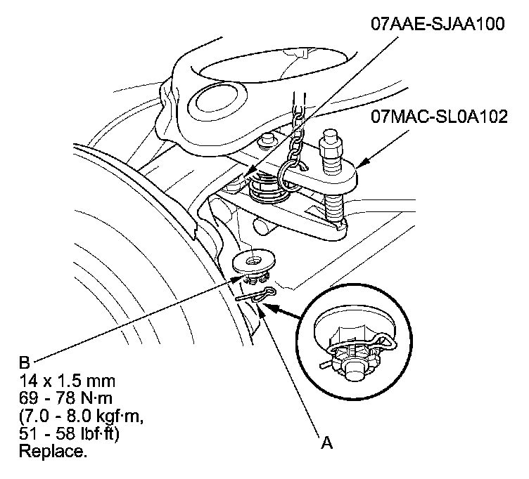 - During installation, to connect the ball joint, position a floor jack under the connecting point of the knuckle and lower arm A, and raise the suspension with the jack.
