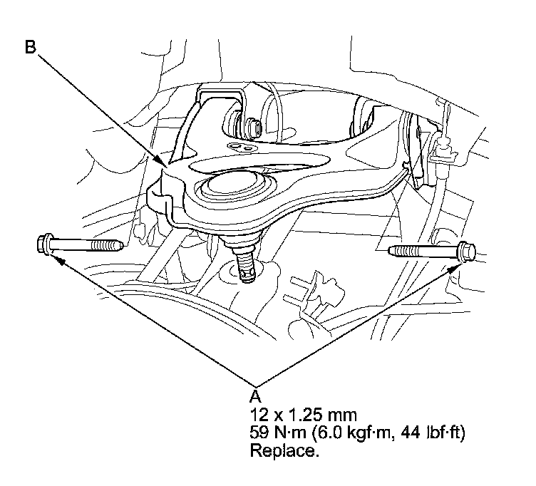 9. Remove the upper arm mounting bolts (A), then remove the upper arm (B).