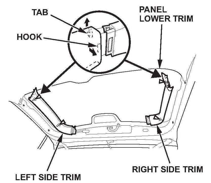 ^ Release the hooks and the tabs from the left and right tailgate side trim.