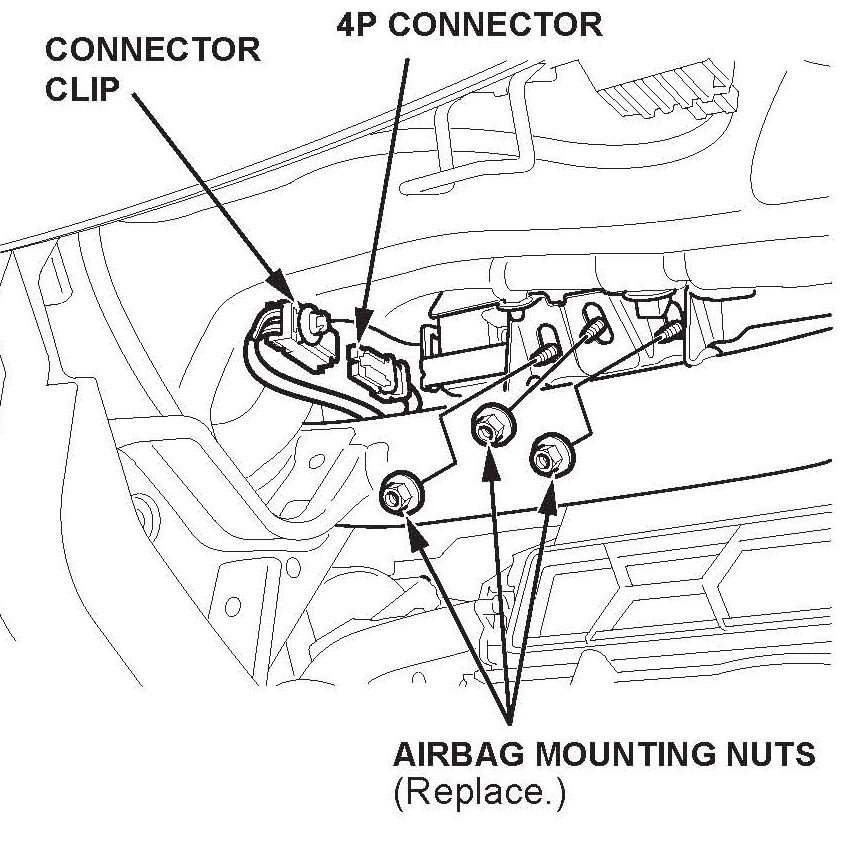 4. Detach the connector clip, then disconnect the front passenger's airbag inflator 4P connector. Remove the airbag mounting nuts. The nuts will not be reused.
