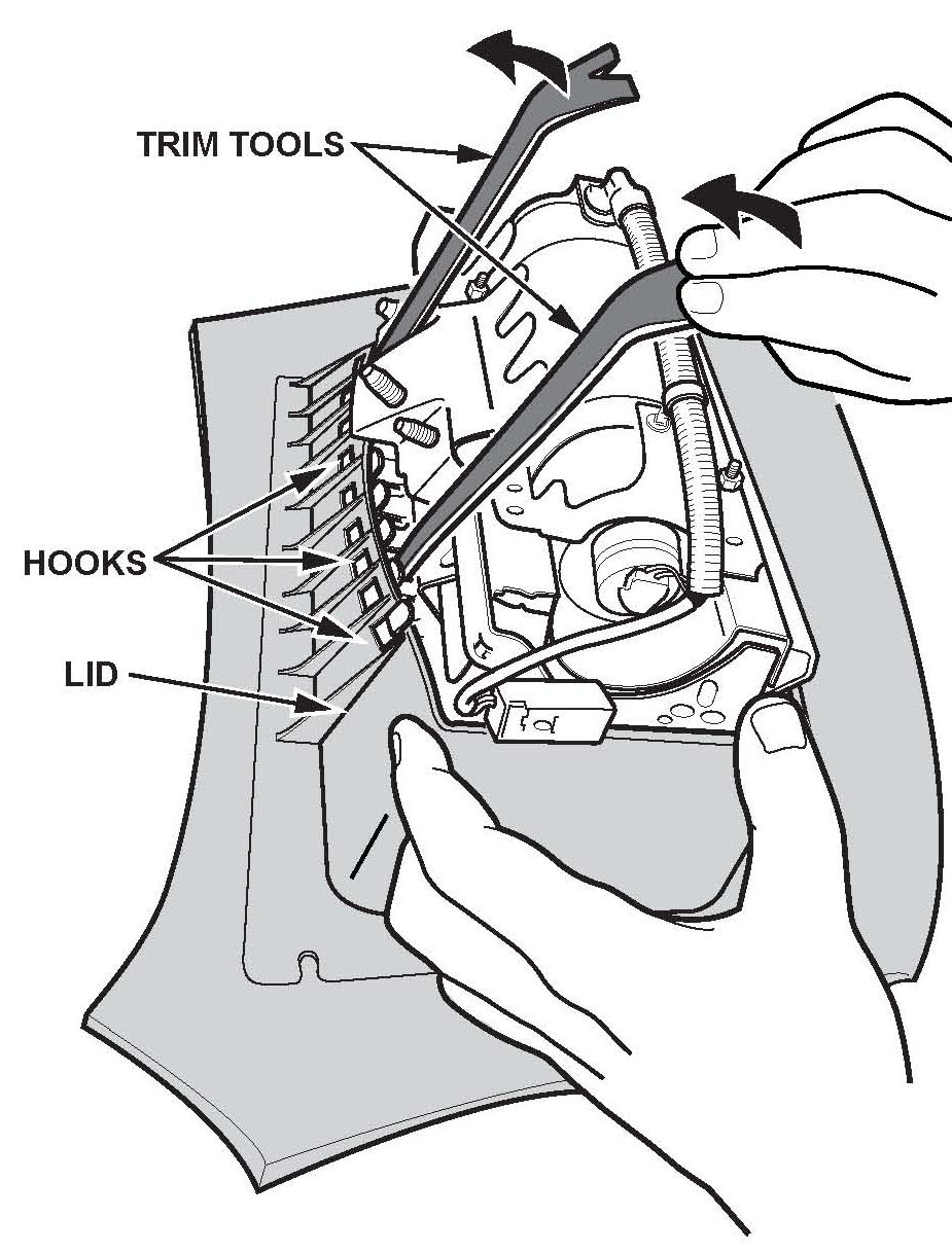 ^ With the help of an assistant, pry up on both trim tools to release the hooks from the lid.