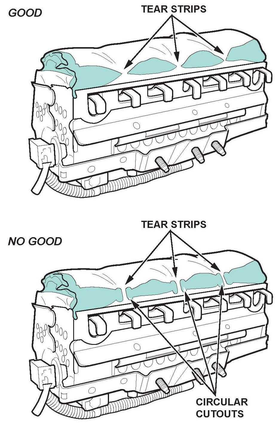 ^ If there are no circular cutouts next to the tear strips, the airbag is OK, Go to step 9.
