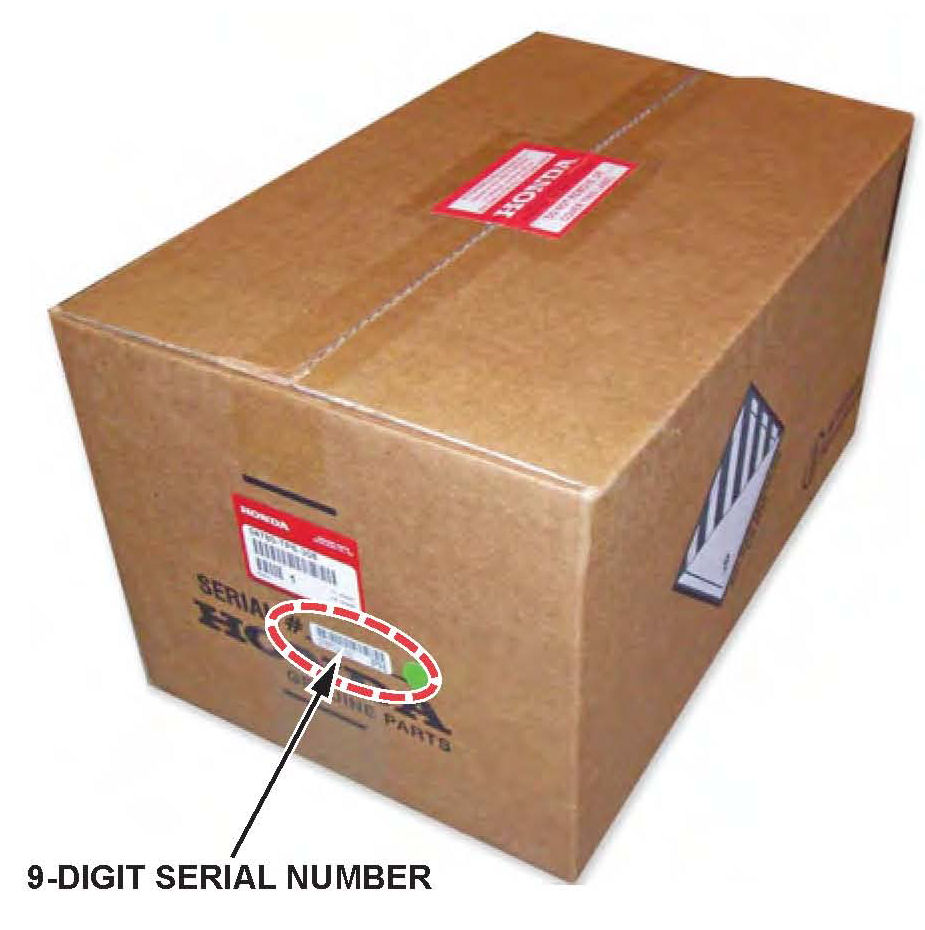 8. Write down the 9-digit serial number located on the right side of the new airbag's box. (There are two rows of numbers on the serial number sticker; the top row is the serial number.) For the warranty claim to be paid, your warranty clerk must enter this 9-digit serial number in the Diagnostic Trouble Codes field on the warranty claim.
