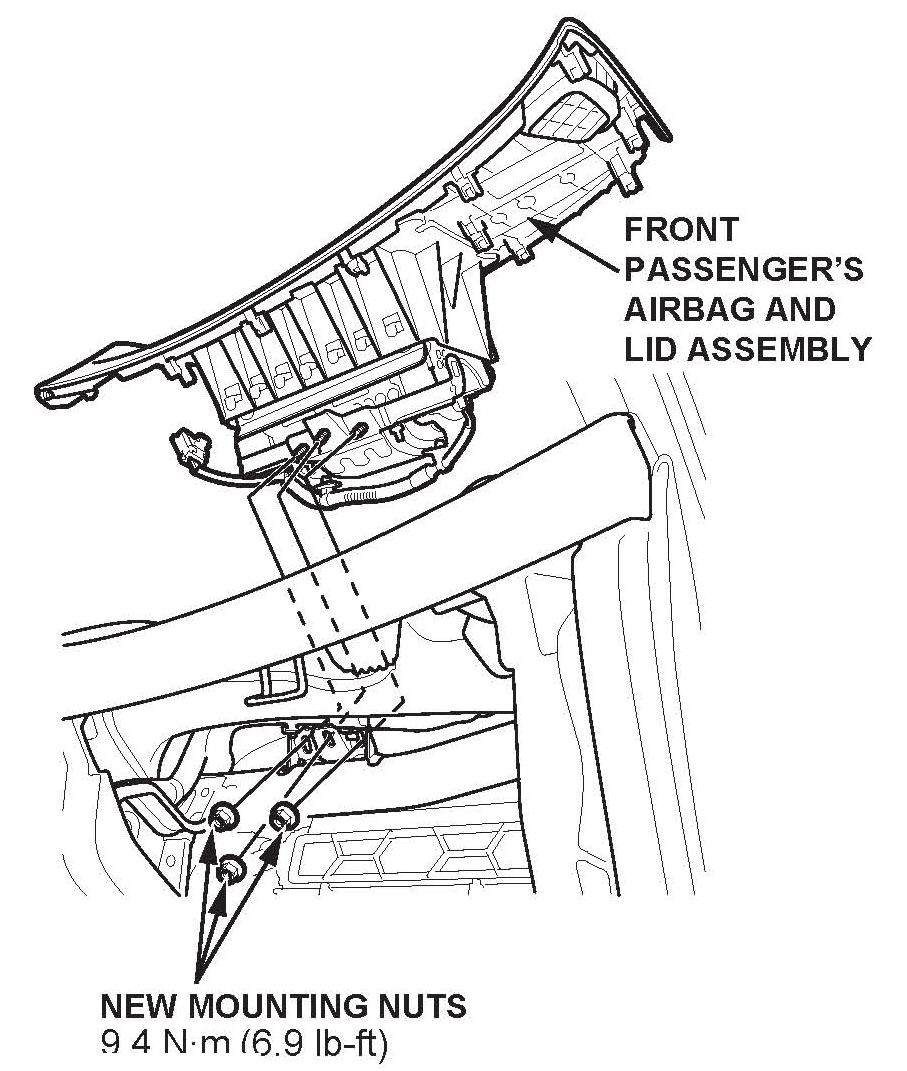 10. Place the front passengers airbag and lid assembly into the dashboard. Torque the front passengers airbag new mounting nuts to 9.4 N~m (6.9 Ib4t).