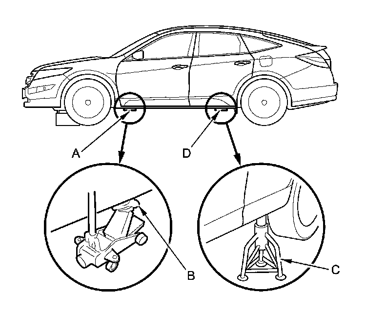 2. Position the floor jack under the vehicle's left front support point (A). Center the jack lift platform (B) on the support point, and jack up the vehicle high enough to fit a safety stand (C) under the vehicle's rear support point (D).