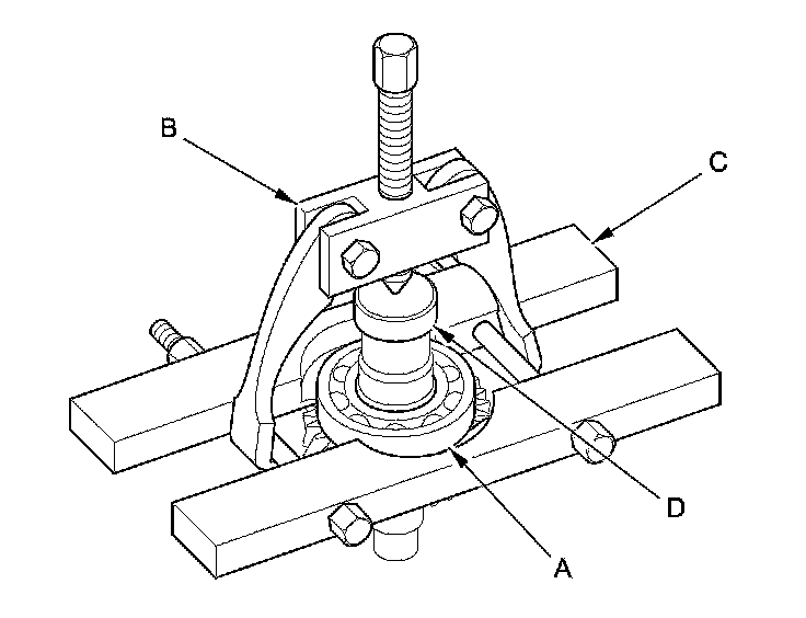 1. Remove the transfer output shaft bearing (A) from the transfer output shaft using a commercially available puller (B), a bearing separator (C), and a spacer (D). Place the spacer between the transfer output shaft and the puller to prevent damaging the transfer output shaft.