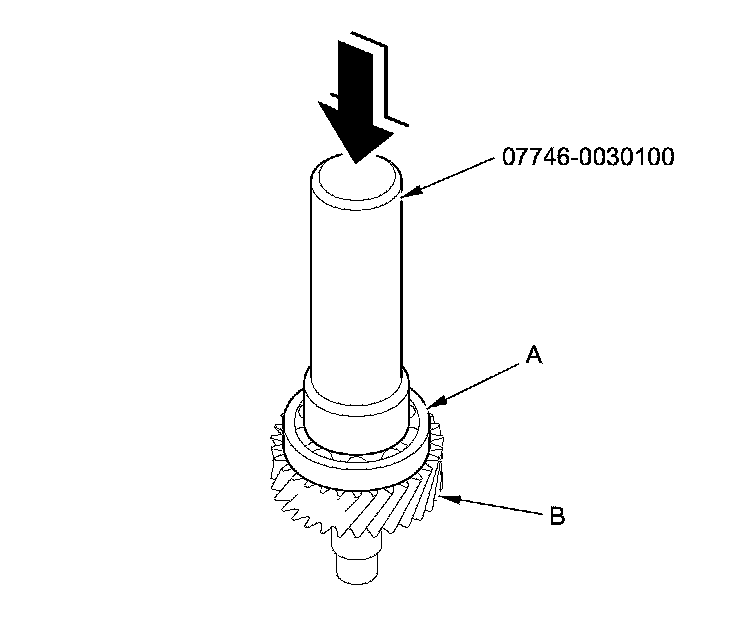 2. Install the bearing (A) on the transfer output shaft (B) using the 40 mm I.D. driver handle and a press.