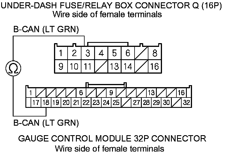 15. Check for continuity between under-dash fuse/relay box connector Q (16P) terminal No. 3 and gauge control module 32P connector terminal No. 18.