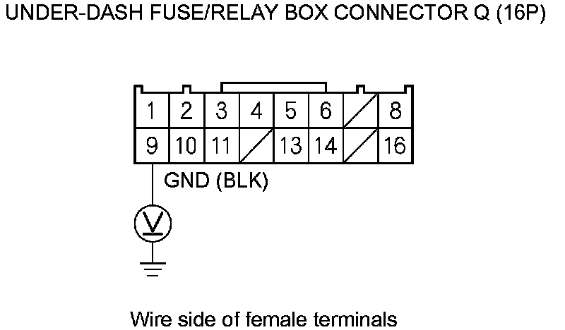 9. Measure the voltage between body ground and under-dash fuse/relay box connector M (34P) terminal No. 16, and between body ground and under-dash fuse/relay box connector Q (16P) terminal No. 9.