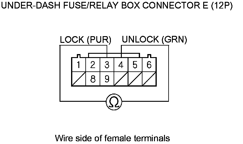 11. Check for continuity between under-dash fuse/relay box connector E (12P) terminals No. 4 (UNLOCK) and No. 3 (LOCK) and body ground individually.