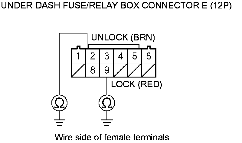 11. Check for continuity between under-dash fuse/relay box connector E (12P) terminals No. 2 (UNLOCK) and No. 9 (LOCK) and body ground individually.