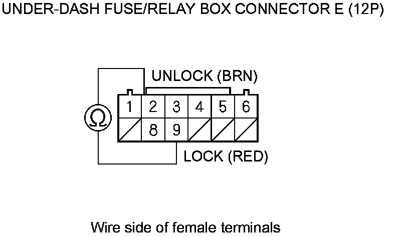 12. Check for continuity between under-dash fuse/relay box connector E (12P) terminals No. 2 (UNLOCK) and No. 9 (LOCK).