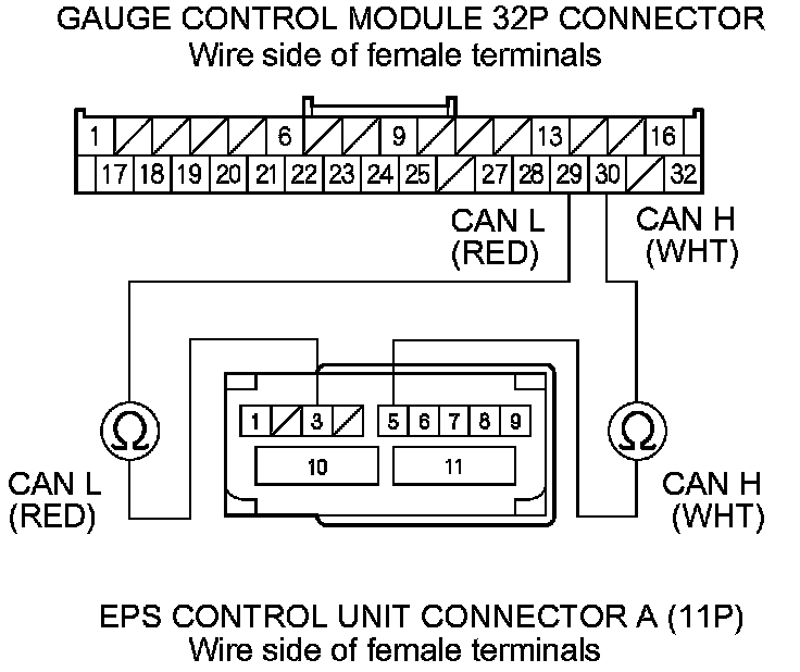 9. Check for continuity between gauge control module 32P connector terminals No. 29 and No. 30 and EPS control unit connector A (11P) terminals No. 3 and No. 5 and body ground respectively.
