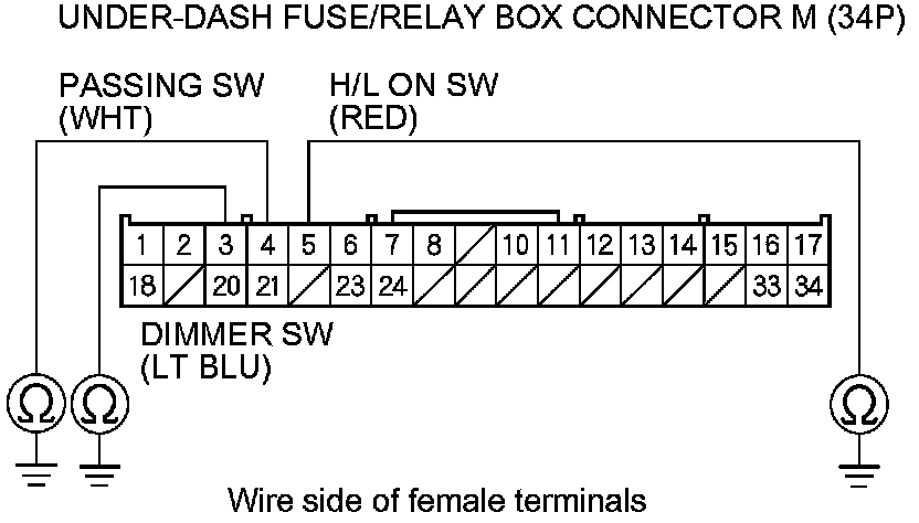 21. Check for continuity between under-dash fuse/relay box connector M (34P) terminals as shown: