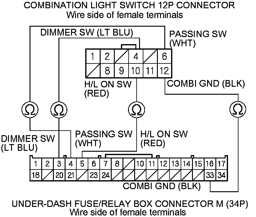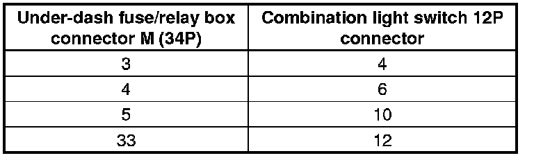 20. Check for continuity between the under-dash fuse/relay box connector M (34P) terminals and the combination light switch 12P connector terminals as shown: