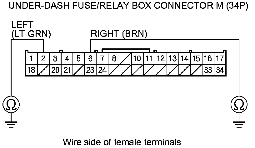 11. Check for continuity between body ground and under-dash fuse/relay box connector M (34P) terminals No. 2 and No. 6 individually.