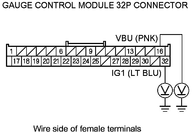 10. Measure the voltage between gauge control module 32P connector terminals No. 16 and No. 32 and body ground individually.