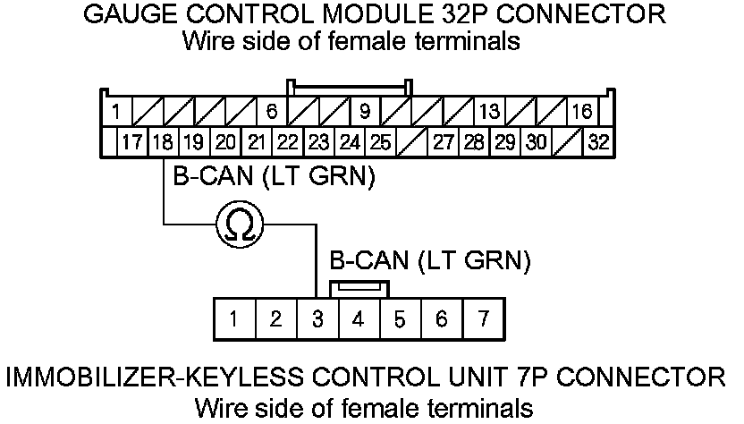 14. Check for continuity between immobilizer-keyless control unit 7P connector terminal No. 4 and the gauge control module 32P connector terminal No. 18.
