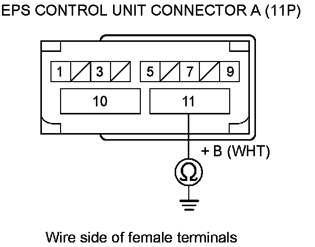 6. Check for continuity between EPS control unit connector A (11P) terminal No. 11 and body ground.