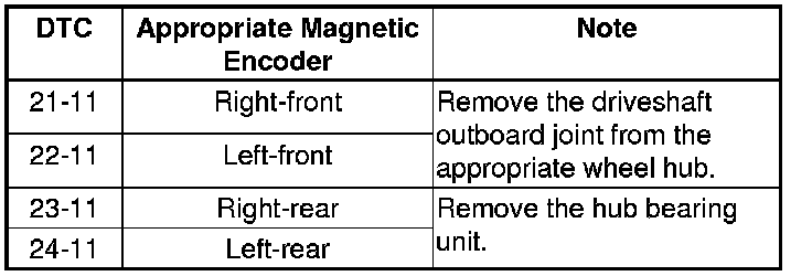 Clean dust or dirt from the appropriate magnetic encoder surface on the wheel bearing or the hub bearing unit, then go to step 1 and recheck. If the DTC is still present, replace the appropriate wheel bearing or hub bearing unit.