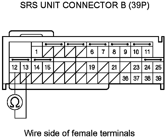 17. Measure the resistance between SRS unit connector B (39P) terminals No. 12 and No. 13. There should be an open circuit or at least 1 MOhms.