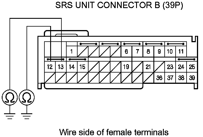 16. Measure the resistance between body ground and SRS unit connector B (39P) terminals No. 12 and No. 13, individually. There should be an open circuit or at least 1 MOhms.