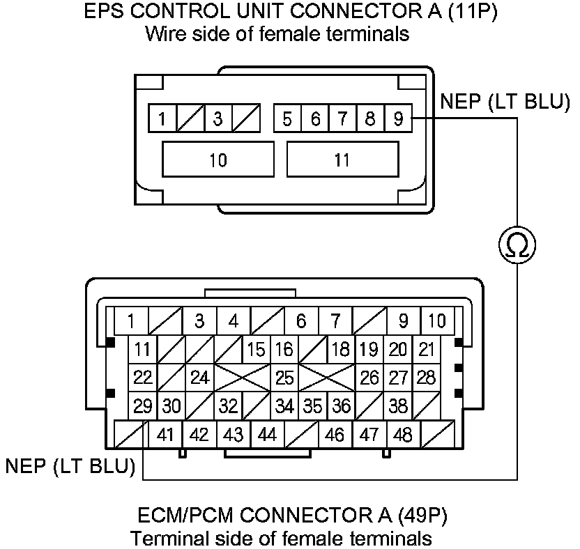 8. Check for continuity between ECM/PCM connector A (49P) terminal No. 29 and EPS control unit connector A (11P) terminal No. 9.