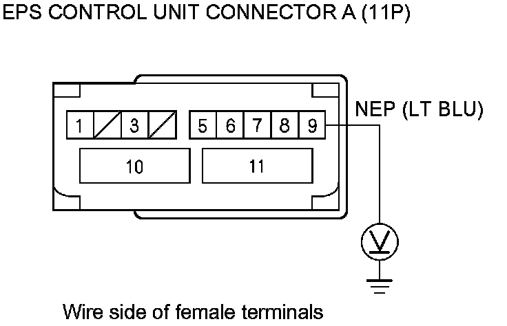 7. Check for continuity between body ground and EPS control unit connector A (11P) terminal No. 9.