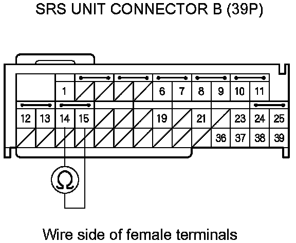 17. Measure the resistance between SRS unit connector B (39P) terminals No. 14 and No. 15. There should be an open circuit or at least 1 MOhms.