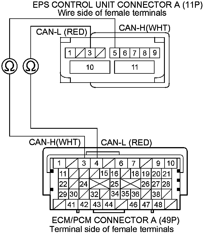 10. Check for continuity between ECM/PCM connector A (49P) terminals and EPS control unit connector A (11P) terminals.