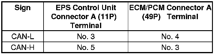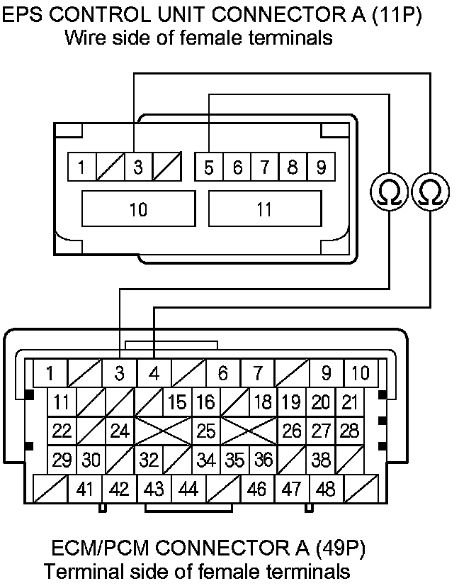 9. Check for continuity between EPS control unit connector A (11P) terminals and ECM/PCM connector A (49P) terminals (see table).