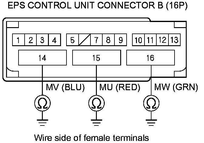10. Check for continuity between body ground and EPS control unit connector B (16P) terminals No. 14, No. 15, and No. 16 individually.