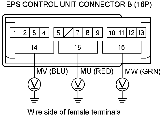 9. Measure the voltage between body ground and EPS control unit connector B (16P) terminals No. 14,No. 15, and No. 16 individually.