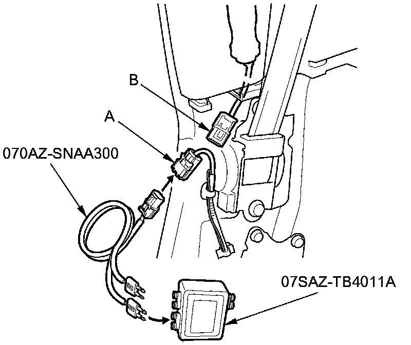 7. Connect the SRS inflator simulator (2 Ohms connectors) and simulator lead L to the floor wire harness.