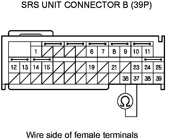 15. Measure the resistance between SRS unit connector B (39P) terminals No. 36 and No. 37. There should be less than 1.0 Ohms.