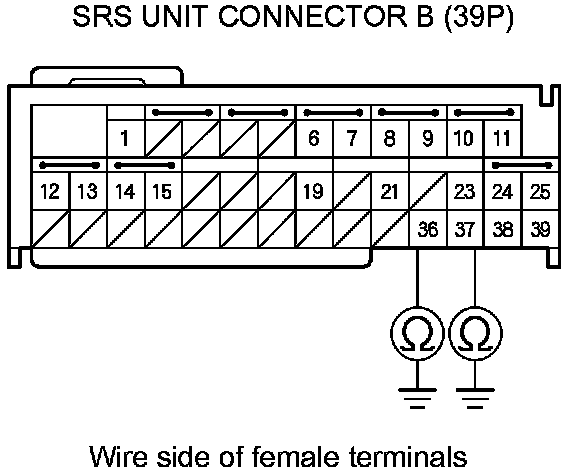 9. Measure the resistance between body ground and SRS unit connector B (39P) terminals No. 36 and No. 37, individually. There should be an open circuit or at least 1 MOhms.