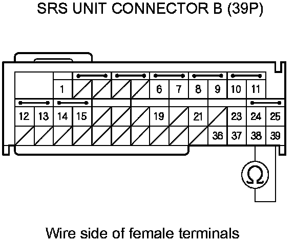 15. Measure the resistance between SRS unit connector B (39P) terminals No. 38 and No. 39. There should be less than 1.0 Ohms.