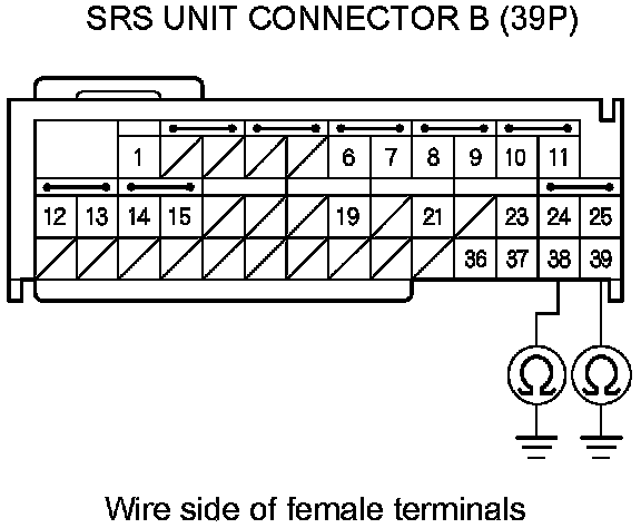 9. Measure the resistance between body ground and SRS unit connector B (39P) terminals No. 38 and No. 39, individually. There should be an open circuit or more than 1 MOhms.
