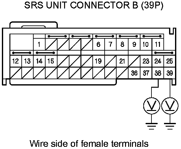 12. Measure the voltage between body ground and SRS unit connector B (39P) terminals No. 38 and No. 39, individually. There should be less than 0.2 V.
