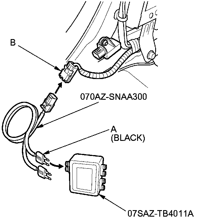 14. Connect the SRS inflator simulator (jumper connector) and the black lead of simulator lead L (A) to the floor wire harness 4P connector (B).