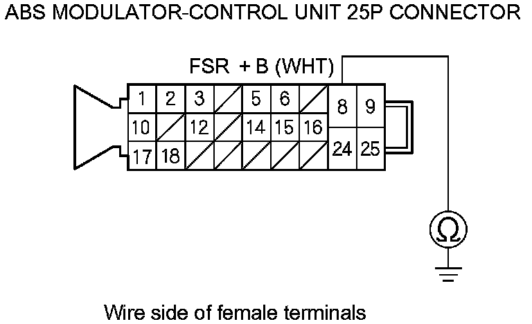 8. Check for continuity between ABS modulator-control unit 25P connector terminal No. 8 and body ground.