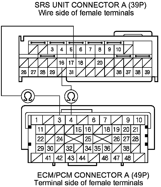 11. Check for continuity between SRS unit connector A (39P) terminals No. 16 and No. 17, and ECM/PCM connector A (49P) terminals No. 4 and No. 3, individually.