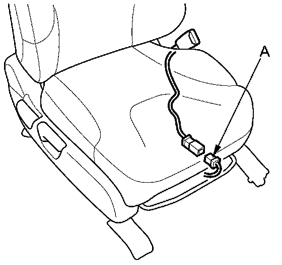 6. Disconnect the floor wire harness 2P connector (A) from the front passenger's seat belt buckle switch.