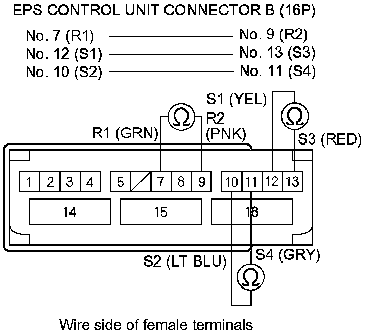 9. Measure the resistance between the following terminals of EPS control unit connector B (16P).