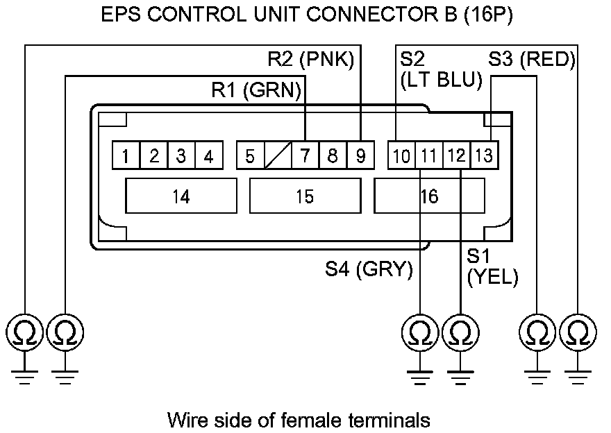 10. Check for continuity between body ground and EPS control unit connector B (16P) terminals No. 7,No. 9,No. 10,No. 11,No. 12, and No. 13 individually.