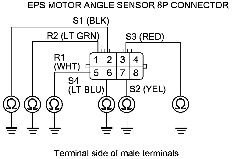 14. On the sensor side, measure the resistance between the following terminals of the EPS motor angle sensor 8P connector.